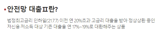 서민금융진흥원 안전망 대출은 법정최고금리가 지난 21년 7월 7일부터 인하됨에 따라 연 20% 이상 초과하는 고금리 대출을 이용하고 계신 분의 대체상환을 지원하는 정부지원 대환대출 상품입니다.