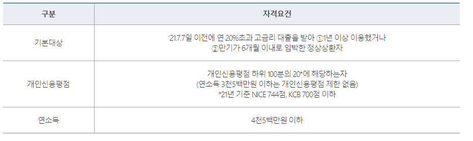 서민금융진흥원 안전망대출은 2021년 7월 7일 이전에 연 20%를 초과하는 고금리 대출을 받아 1년이상 정상 이용중이거나 만기가 6개월 이내로 임박한 분이 아래의 요건중 하나를 충족하면 신청할 수 있습니다.