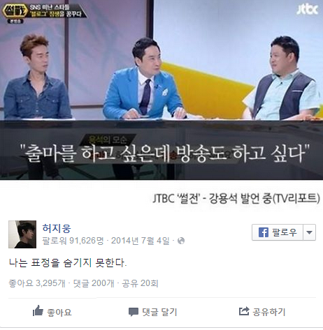 반면에 허지웅이 강용석에 대하여 언급을 하기도 하지만, 별로 우호적이지는 않습니다.