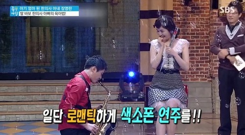 장영란은 고정 게스트로 출연을 했었고, 한창은 일반인 출연자로 참여를 했지요. 한창은 방송에서 색소폰 연주를 장영란에게 해주며 장미꽃을 건네며 두 사람의 인연이 시작되었습니다. 방송의 재미를 위하여 연출된 장면이었지만, 한창이 장미꽃을 주자 눈물까지 글썽이며 좋아했지요.
