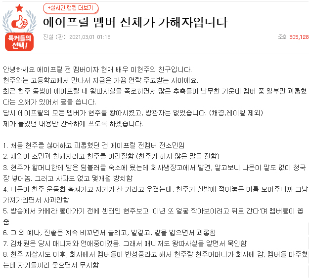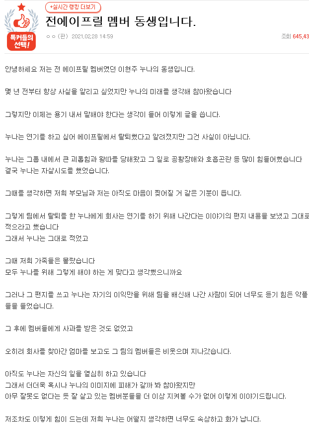 작성자는 "누나의 미래를 생각해 참아왔지만 이제는 용기 내서 말해야 한다는 생각이 들었다"라며 "누나는 연기를 하고 싶어 에이프릴을 탈퇴했다고 알려졌지만 사실이 아니다. 누나는 그룹 내에서 큰 괴롭힘과 왕따를 당해왔고 그 일로 공황장애와 호흡 곤란 등 많이 힘들어했다. 결국 누나는 자살시도를 했었다"고 폭로했습니다.