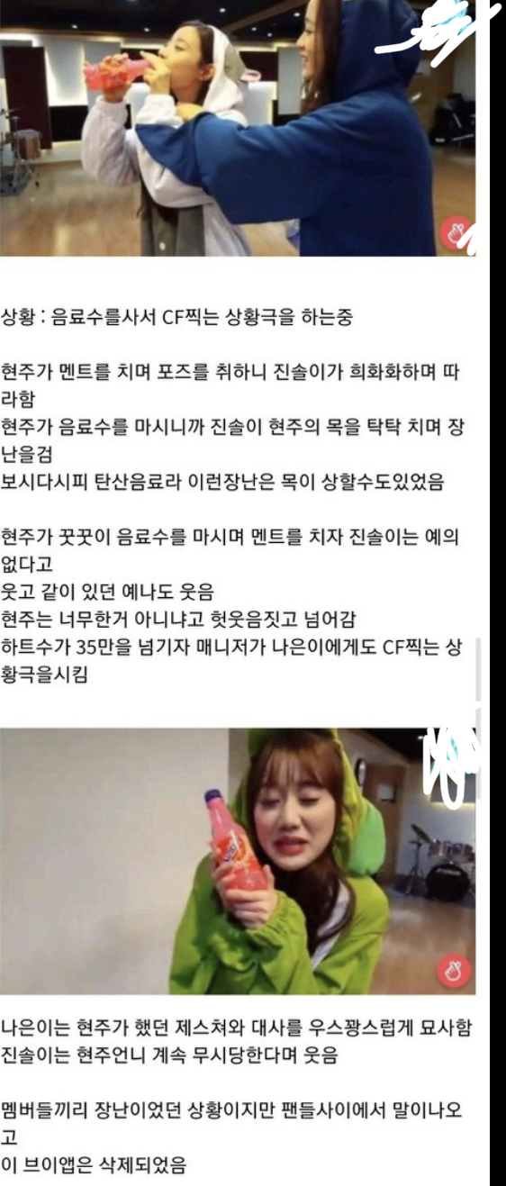 B씨는 "처음 현주를 싫어하고 괴롭혔던 건 에이프릴 전 멤버 전소민이다. 채원이 소민과 친해지려고 현주를 이간질했다. 나은이 현주 운동화를 훔쳐 가고 자기가 산 거라고 우겼다. 그 외 예나, 진솔은 계속 비꼬면서 놀리고, 발 걸고, 발을 밟으면서 괴롭혔다"고 전했습니다.