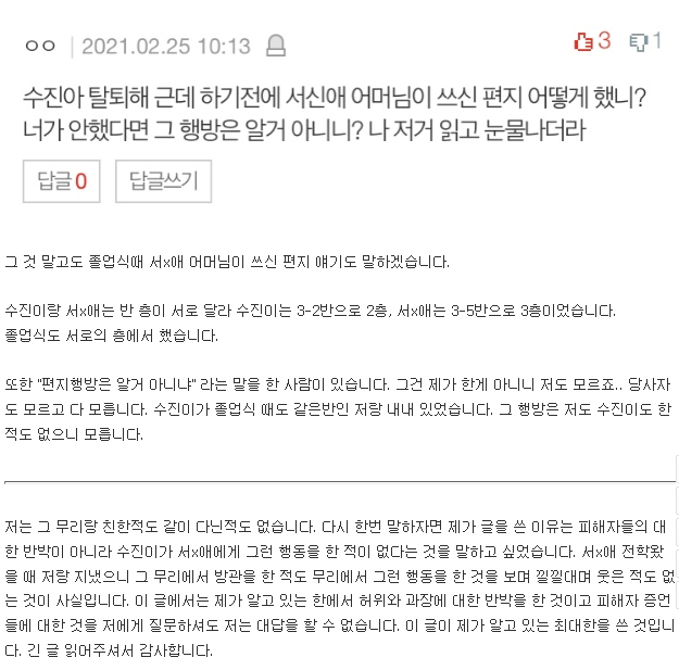 23일 온라인 커뮤니티에는 수진 학폭 최초 폭로자인 A씨가 장문의 글을 게재했습니다.