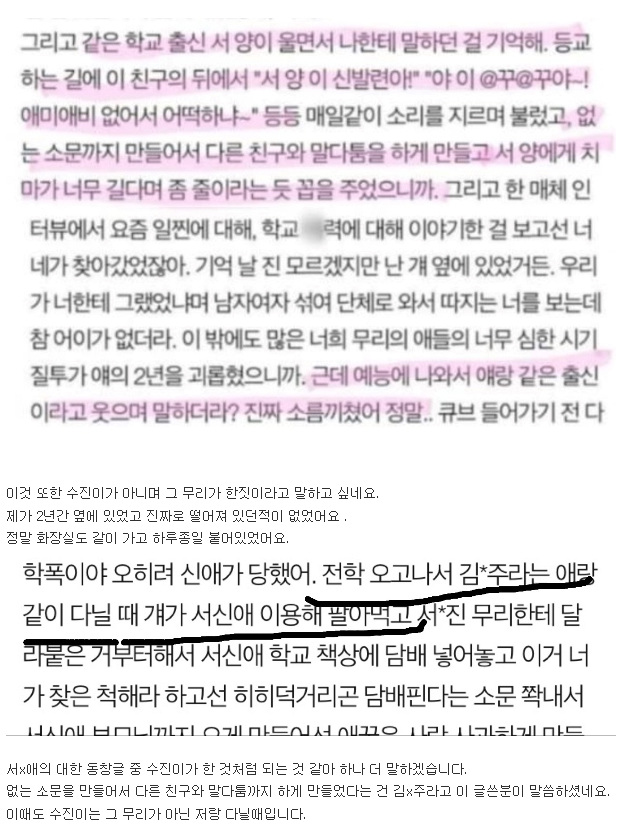 그룹 여자아이들 수진이 학교폭력 의혹에 오히려 수진이 피해자였다는 주장이 제기되었습니다.