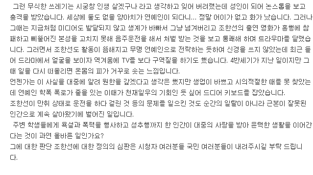 이어, A씨는 "언젠가 이 사실을 대중에 알려 원한을 갚겠다고 생각은 했지만 생업이 바쁘고 시의적절한 때를 못 찾았는데 연예인 학폭 폭로가 줄을 잇는 이때가 천재일우의 기회인 듯 싶다"며 "주변 학생들에게 욕설과 폭력을 행사하고 성추행까지 한 인간이 대중의 사랑을 받아 윤택한 생활을 이어간다는 것이 과연 올바른 일이냐. 그에 대한 판단, 조한선에 대한 정의의 심판은 국민 여러분이 내려달라"고 덧붙였습니다.