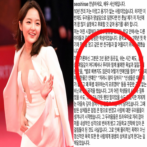 서신애는 (여자)아이들 수진은 2년 동안 등굣길, 쉬는 시간 복도, 급식실, 매일같이 어디에서나 무리와 함께 불쾌한 욕설과 낄낄거리는 웃음, "별로 예쁘지도 않은데 어떻게 연예인을 할까", "어차피 쟤는 한물간 연예인", "저러니 왕따 당하지", "선생들은 대체 뭐가 좋다고 왜 특별 대우하는지 모르겠어" 등등 꾸준한 근거 없는 비난과 인신공격을 했다고 밝혔습니다.
