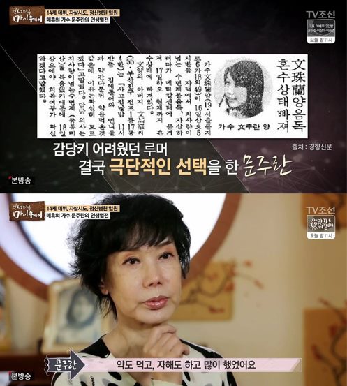 문주란은 "그 이후에도 계속 연탄불을 방 안에 피우기도 했고, 약도 먹고, 자해도 하고 많이 했었다. 자꾸 그런 짓을 하니까 박 선생님 (고 박춘석 작곡가)이 나를 정신병동에 가뒀다"고 털어놨습니다.