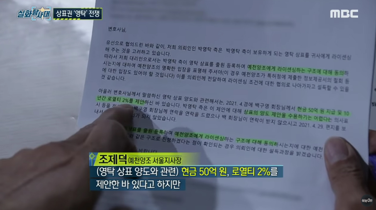예천양조 측이 지난 7월 영탁과의 막걸리 모델 재계약 불발 과정에서 "영탁 측이 모델료 별도, 상표 관련 현금과 회사 지분 등 1년간 50억 원, 3년간 150억 원에 달하는 금액을 요구했고, 최종 기한일까지 금액 조율을 거부했다"고 주장했습니다.