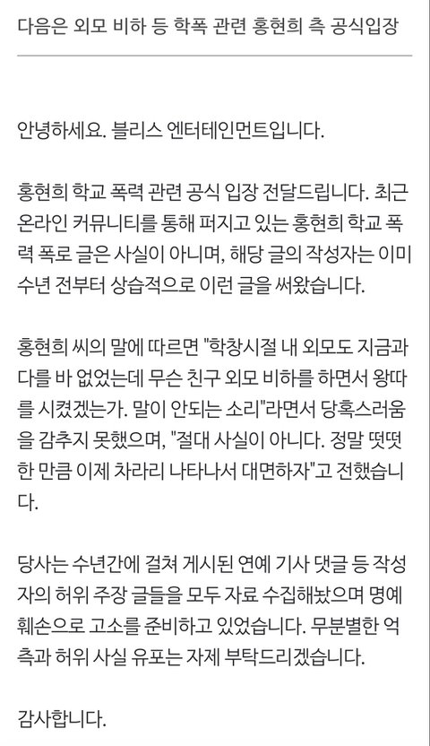 이에 홍현희의 소속사 블리스 엔터테인먼트는 "최근 온라인 커뮤니티를 통해 퍼지고 있는 홍현희 학교 폭력 폭로 글은 사실이 아니며, 해당 글의 작성자는 이미 수년 전부터 상습적으로 이런 글을 써왔다"라고 밝혔습니다.