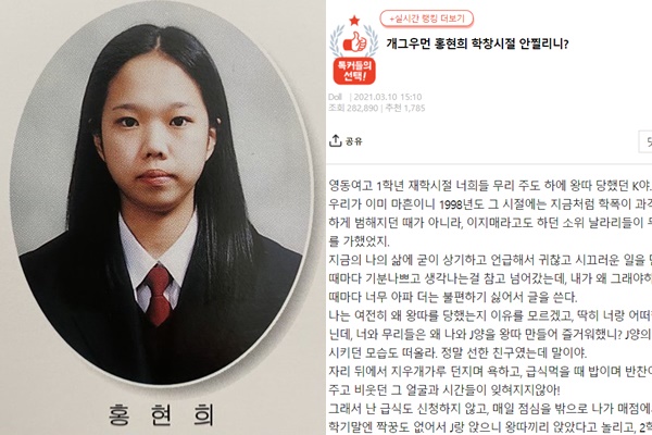 지난 10일 자신을 홍현희의 고등학교 동창이라고 소개한 K 씨는 네이트판에 글을 올리고, 학창 시절 홍현희가 자신을 왕따 시키고 괴롭혔다고 주장했습니다.