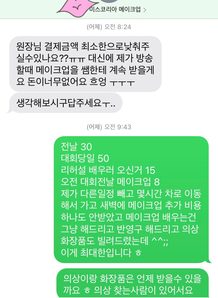 창원과 부산 지역에서 방송국을 중심으로 메이크업과 헤어 분장 일을 10년째 하고 있다는 작성자 A 씨는 "아나운서 B 씨에게 미스코리아 대회 출전 명목으로 수차례 메이크업과 헤어를 해드린 후 돈을 한 푼도 받지 못했다"고 주장했습니다.