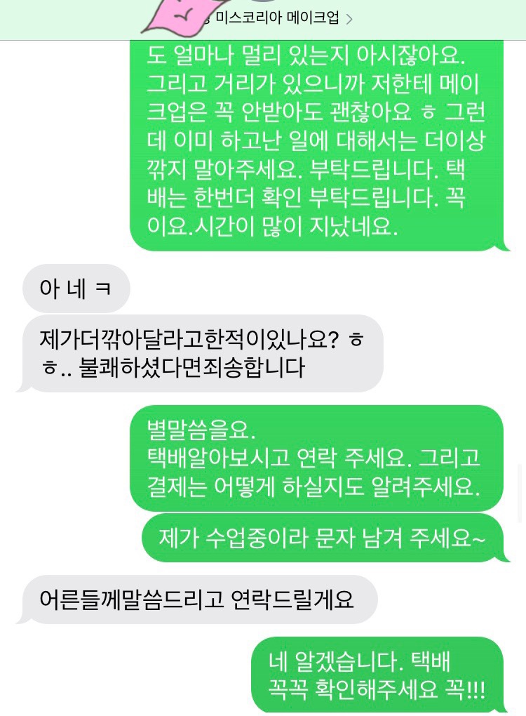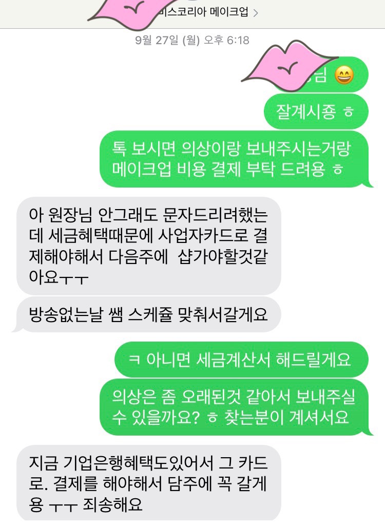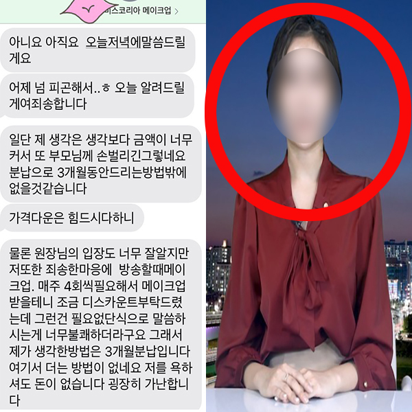A 씨는 B 아나운서와 주고받은 문자를 공개하며 마지막 경고를 했다고 하는데요, 그는 "결제가 밀렸으면 사과부터 하고 양해를 구하는 것이 기본 도의 아닐까요? 앞으로는 저처럼 더러운 경우를 겪는 메이크업 아티스트들이 더 이상 생기지 않았으면 하는 바람입니다"라고 전했습니다.