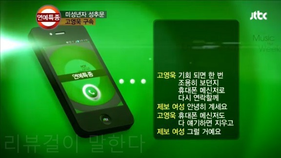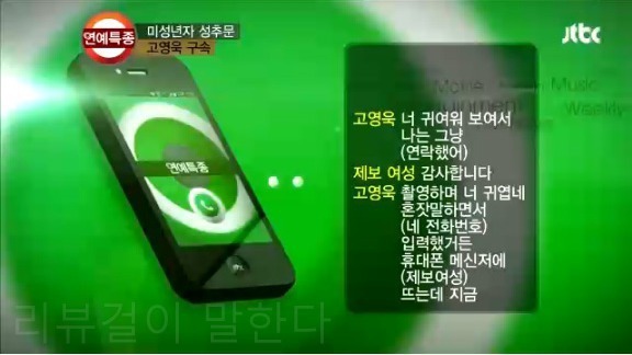 위에 통화내용 이미지는 JTBC 1월4일 연예특종 1월4일 방송분에서, 자숙중이던 고영욱으로부터 만남을 제안받았다는 제보자와의 인터뷰 내용입니다.
