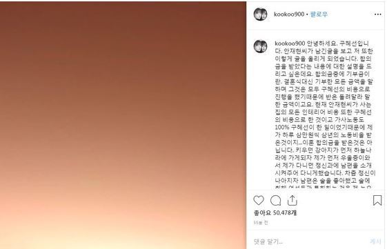 그리고, "현재 안재현이 사는 집의 모든 인테리어 비용 또한 제 비용으로 한 것이고 가사노동도 100% 제가 한 일이기 때문에 하루 3만 원씩 3년의 노동비를 받은 것이지 이혼 합의금을 받은 것은 아닙니다"라고 밝혔다.