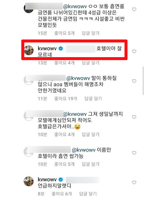 이후 한 네티즌은 "전화로 호텔에 컴플레인 걸었고, 증거 사진도 이메일로 보냈다. 호텔에서 죄송하다고 제보해줘서 감사하다고 했다. 연예인이 투숙한 거 전혀 몰랐다더라"라고 밝혔습니다.
