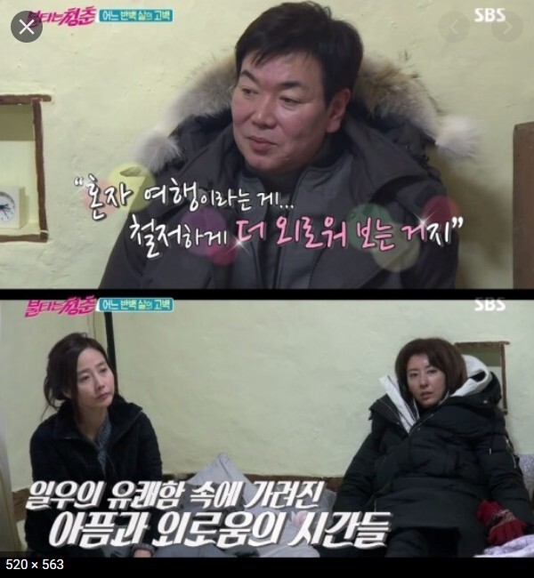 김일우씨는 지금 내 곁에 있는 사람들의 소중함을 너무 알았다며 혼자라는 외로움에 여전히 시달리지만 불타는 청춘을 통해 만난 김완선, 홍진희, 서태화씨 등등 친구들과 우정을 나누며 한결 외로움을 덜 느끼시는 듯 합니다.