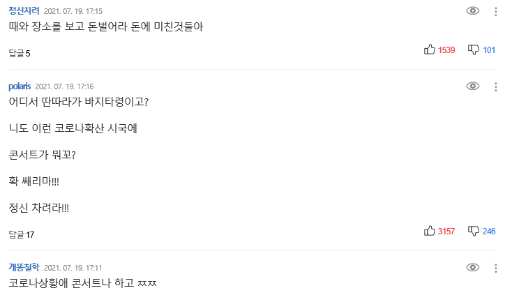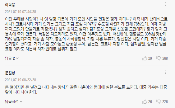 신대철은 "코로나 확진자 수가 최대를 기록하고 있는 비상시국입니다. 그래도 공연을 하시겠다면 힘없고 못 나가는 후배들이 뭐 어쩔 도리는 없습니다만"이라고 비꼬았다.