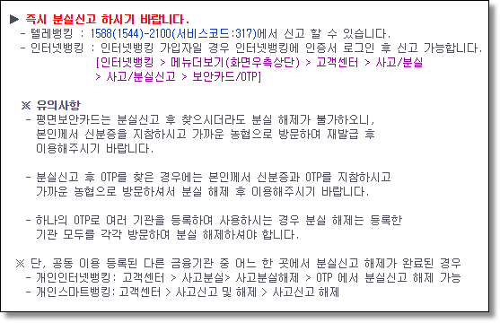 인터넷뱅킹 외에도 농협 고객센터 1588(1544)-2100에서 신고할 수 있습니다. 만약, 사용하던 평면보안카드를 찾더라도 분실해제가 불가능하지만 OTP의 경우 신분증과 OTP를 지참 후 농협을 방문하면 분실해제 후 사용할 수 있습니다.