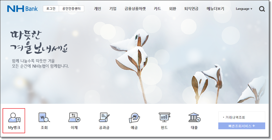 홈페이지에 접속하면 아래 빠른조회서비스 항목들이 나옵니다. 이체한도 변경은 마이뱅크에서 설정할 수 있습니다. 설정하기 전에 공인인증서 또는 농협 아이디로 로그인부터 해주세요.