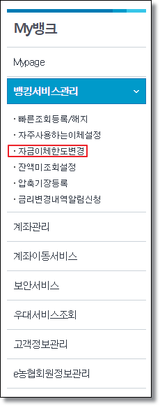 마이뱅크에서 뱅킹서비스관리를 누르면 위 사진처럼 여러가지 항목들이 나옵니다. 세번째 [자금이체한도변경]을 눌러주세요.
