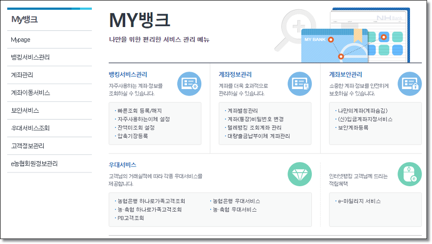 로그인하고 마이뱅크 페이지로 접속하면 여러가지 서비스들이 나옵니다. 인터넷으로 계좌 비밀번호를 변경할 수 있으며 잔액미조회 설정 등을 할 수 있으니 필요하신 분들은 인터넷으로 해결하시기 바랍니다.