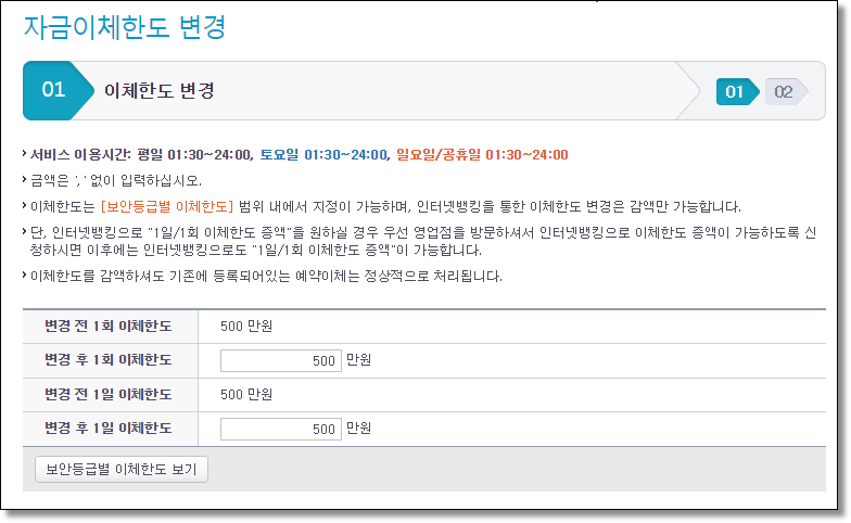 그럼 이렇게 이체한도를 설정할 수 있습니다. 전 현재 1회 이체한도가 500만원으로 설정되어 있는데요. 농협은 보안등급에 따라 한도를 정해놓고 있습니다.
