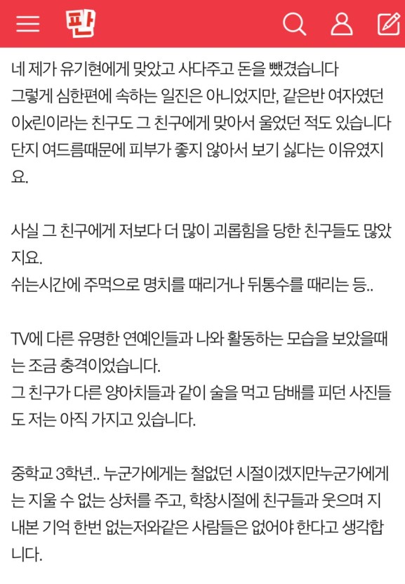 적성자 A씨는 "경기도 일산에 있는 신일중학교에서 졸업했으며 3학년 때 유기현과 같은 반이었다"고 밝혔습니다. 이어 그는 "기현이 당시에도 끼도 많고 잘나가는 일진이었다. 나를 비롯한 몇몇 아이들은 '찐따'라고 불리며 왕따를 당하고 맞기도 하고 이상한 소문에 휘말리기도 했다"고 전했습니다.