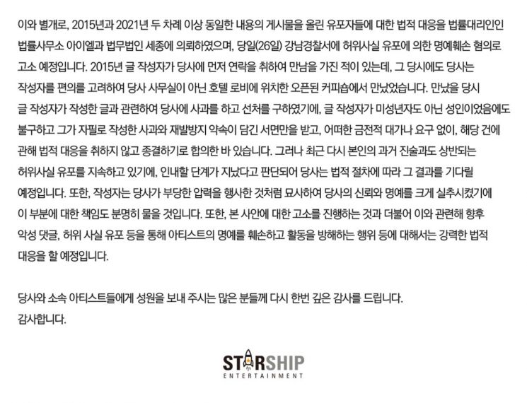 <기현 스타쉽엔터테인먼트 소속사 공식입장>