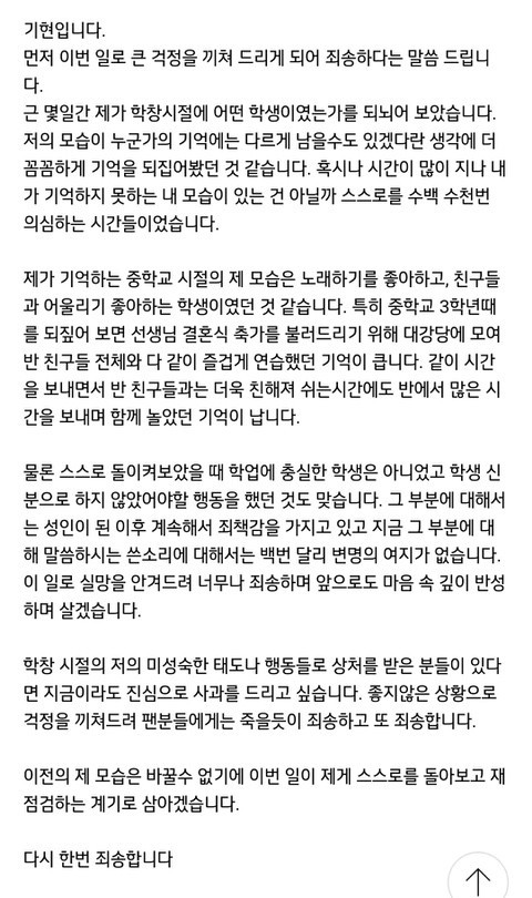오늘 26일 기현은 몬스타엑스 공식 팬카페에 사과글을 게재했습니다. 기현은 "먼저 이번 일로 큰 걱정을 끼쳐 드리게 되어 죄송하다는 말씀드린다"며 "근 며칠간 제가 학창 시절에 어떤 학생이였는가를 되뇌어 보았다"고 입을 열었습니다.
