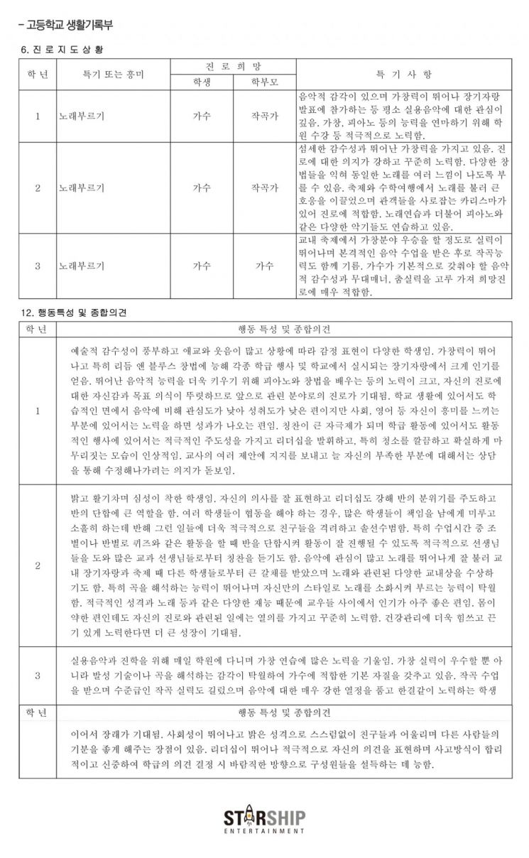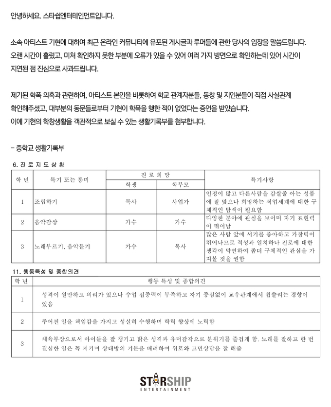 이어 "제기된 학폭 의혹과 관련하여, 아티스트 본인을 비롯하여 학교 관계자분들, 동창 및 지인분들이 직접 사실 관계 확인을 해주셨고, 대부분의 동문들로부터 기현이 학폭을 행한 적이 없었다는 증언을 받았습니다. 이에 기현의 학창생활을 객관적으로 보실 수 있는 생활기록부를 첨부한다"고 밝혔습니다