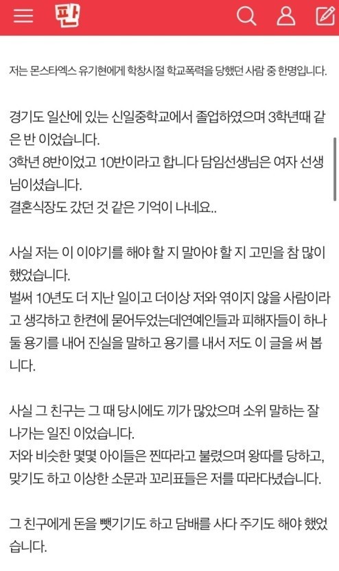 적성자 A씨는 "경기도 일산에 있는 신일중학교에서 졸업했으며 3학년 때 유기현과 같은 반이었다"고 밝혔습니다. 이어 그는 "기현이 당시에도 끼도 많고 잘나가는 일진이었다. 나를 비롯한 몇몇 아이들은 '찐따'라고 불리며 왕따를 당하고 맞기도 하고 이상한 소문에 휘말리기도 했다"고 전했습니다.