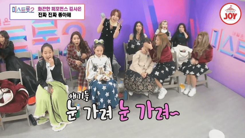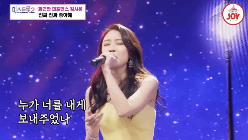 본선 2차전에서 혜은이의 <진짜진짜 좋아해>를 불렀습니다. 노래 중간에는 남편인 성민과 키스 퍼포먼스를 선보였는데요. 심사위원들은 물론 대기실에 있던 참가자들도 반응이 폭발했습니다.