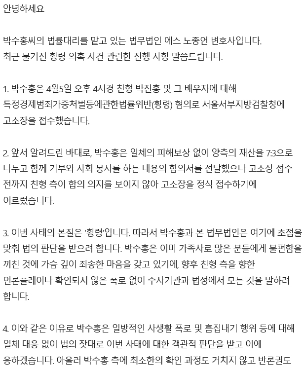 박수홍 측은 "친형과 30년 전부터 2020년 7월까지 매니지먼트 명목으로 법인을 설립한 후 수익을 8:2에서 시작해 7:3 비율로 분배하기로 약정한 바 있다"며 "법인의 모든 매출은 박수홍으로부터 발생했다. 그러나 친형 및 그 배우자는 7:3 배분 비율도 지키지 않았다"고 했습니다.