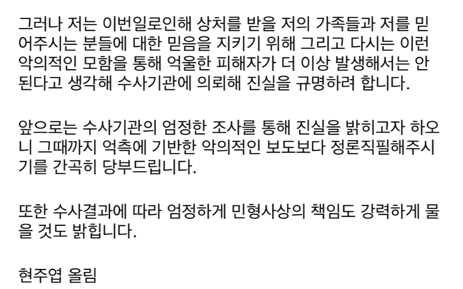 농구 스타 출신 방송인 현주엽이 자신에게 제기된 학교폭력 의혹을 반박하고 법적 대응 의사를 밝혔습니다.
