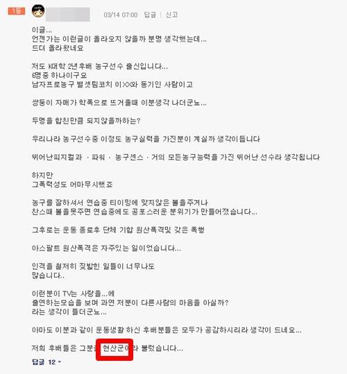 한 온라인 커뮤니티에는 '당대 최고의 농구선수 H씨의 학폭 진실' 이라는 제목의 글이 게재되었는데요, 자신을 H씨와 같은 학교에서 운동을 했던 2년 후배라고 소개한 글쓴이는 "H씨는 후배들을 단체 집합시키는 것은 물론 주먹이나 발로 폭행하기도 하고, 후배들이 잘못할 경우 장기판의 모서리고 때리기도 했다"며 글을 썼습니다.