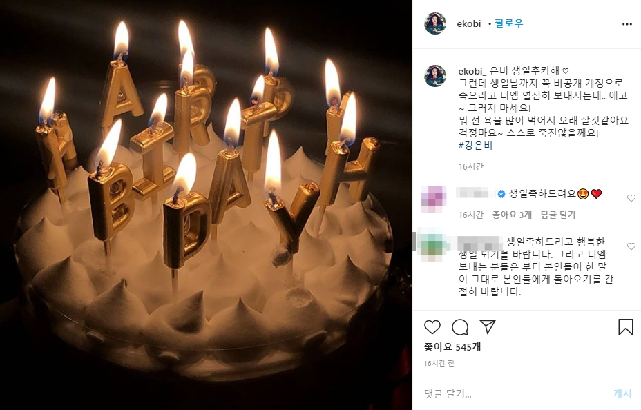 15일 강은비는 인스타그램 DM(다이렉트메세지)를 공개하며 "은비 생일 축하해"라며 "그런데 생일날까지 꼭 비공개 계정으로 죽으라고 디엠 열심히 보내시는데 그러지 마세요. 전 욕을 많이 먹어서 오래 살 것 같아요. 걱정마요. 스스로 죽진 않을게요"라는 글을 게재하며 강은비는 악플에 대해 일침을 날렸다.