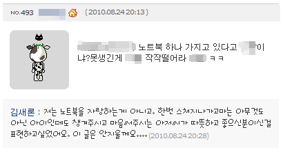 어려서부터 유명세를 타다보니 악플도 많이 시달렸는데요. 2010년 김새론이 원빈에서 노트북 선물을 받자 한 쓰레기가 미니홈피에 악플을 달았는데요. 김새론의 대처가 현명해보입니다. 어떻게 보면 안타깝기도 하고 어려서부터 저런 쓰레기들한테 공격당하니 ..ㅠㅠ