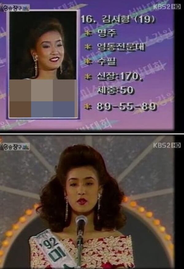 그리하여 1992 '미스코리아 강원도' 대회에 참가한 김서형은 '삼성전자상'을 수상 받았고, 서울 대회까지 나가려 했지만 많은 돈이 필요했기에 서울 대회는 포기를 하게 됩니다.