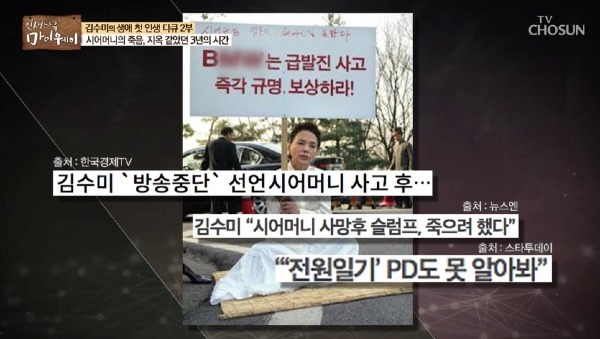 김수미는 시어머니 인품에 반해 남편과 결혼을 결심했을 만큼 시어머니를 향한 애정이 각별했습니다. 그런 시어머니가 김수미의 연극 포스터를 붙이러 나갔다가 자동차 급발진 사고로 사망했습니다.