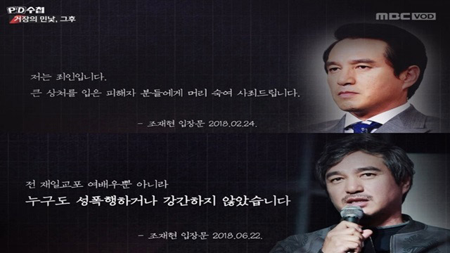 조재현은 2018년 성폭력 고발 운동인 미투(me too 나도 피해자다) 운동 속에 여러 차례 가해자로 지목된 이후 대중에 사과하고 활동을 중단했습니다.