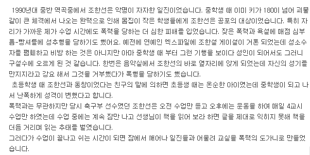 폭로자 A씨는 "조한선은 악명이 자자한 일진이었다. 중학생 때 이미 키가 180이 넘어 괴물같이 큰 체격에서 나오는 완력으로 몸집이 작은 학생들에겐 공포의 대상이었다"며 "잦은 폭력과 욕설에 매점 심부름-빵셔틀에 성추행을 당하기도 했다"고 주장했습니다.
