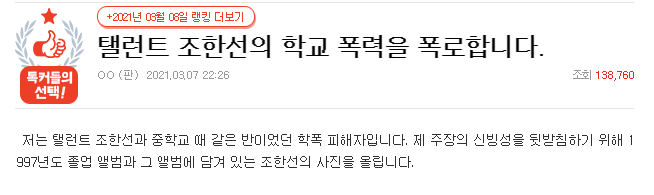 폭로자의 말처럼 학교에서 대단하다 싶을 정도의 일진이고 악랄한 행동을 일삼았다면 동창생들을 중심으로 추가적인 폭로가 이어질 가능성도 충분히 존재합니다. 다만, 그런 추가적인 폭로나 결정적인 증거 등이 존재하지 않는다면 조한선 학폭 폭로는 제대로 검증하기 쉽지 않은 것도 현실입니다.