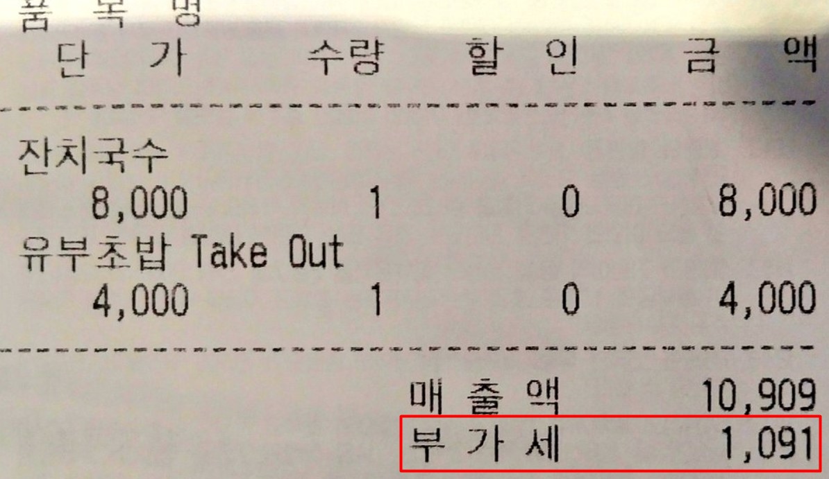 즉, 소비자가 물건을 살 때마다 의무적으로 내야 하는 소비세입니다. 영어로는 VAT(Value added tax)라고 부르는데. 물건이나 서비스를 받고 계산한 영수증을 보면 결제한 금액 안에는 늘 부가가치세 10%가 포함되어 있답니다.