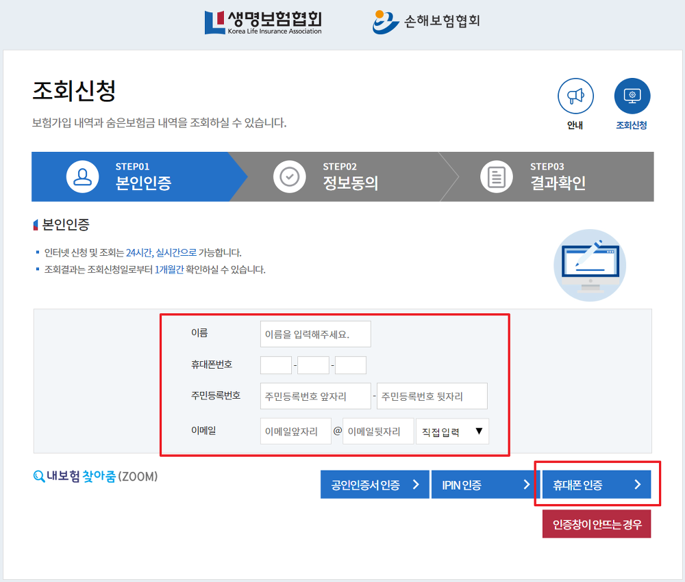 얼른 편지에 있는 내용대로 미청구 보험금 관련 내용을 따라해보았다.