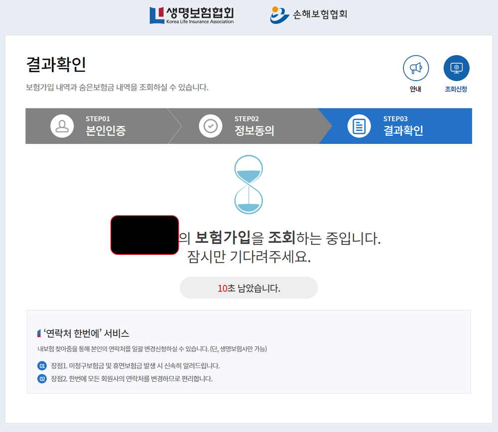 5. 1건의 미청구보험금을 확인 할 수 있었다. 순진한 대학생 때 보험 영업 전화를 받고 거의 강매??로 가입 당했었는데.... 매월 조금씩 쌓이다보니 이제 천만원이 다되어가고 있었다;;; 강매 해줬던 누나 고마워...