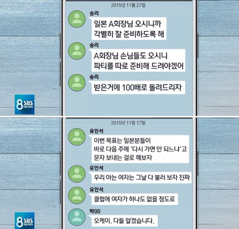 2015년 승리가 유리홀딩스의 전 대표인 유인석씨와 성접대를 준비하면서 주고 받은 것으로 추정되는 카톡 메시지를 확인하고 조사를 벌여왔던 것이다.