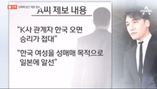 보도에 의하면 경찰은 승리가 2015년 크리스마스 당시 강남 청담동에 있는 고급 주점을 빌려 300명을 초대한 파티를 했는 정확을 포착했는데 그때 일본인 투자자들을 상대로 성매매 알선이 이뤄졌을 가능성이 있다고 보고 있다.