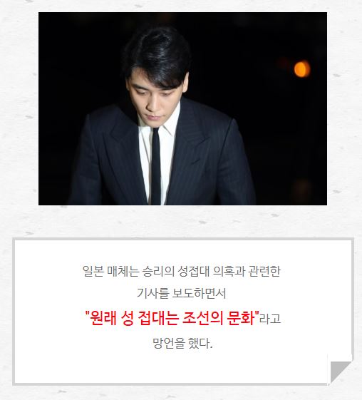 승리의 성 접대 의혹 관련에 대한 기사내용만 보도하지 왜 우리나라를 매춘부의 나라로 표현하고 성접대하는 문화로 몰아가며 막말을 하는 일본의 매체에게 속상함을 감출 수는 없지만 지금 밖에서 바라보는 한국 사회가 그 지경이구나 라고 생각을 해 볼수도 있을 것 같다.