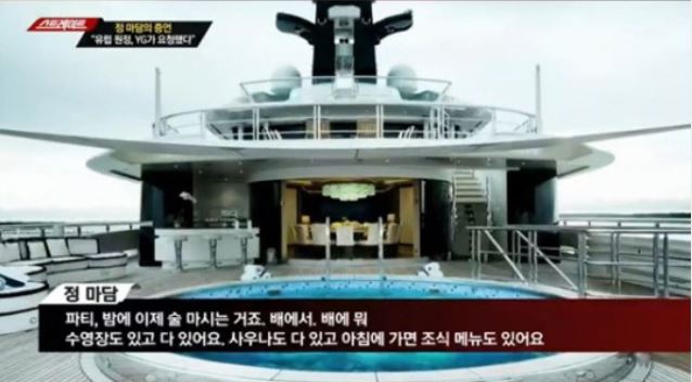 이들은 조로우의 요트 등에 머물렀고 이중 일부 여성은 조로우와 그 일행들의 방에서 함께 방을 보냈는데 이 원정 출장 여정은 총 10일 이었대요. 그러나 그 출장 10일 중에 휴무일이 있어서 동원된 여성들은 유흥업소 근무에 초가근무 5일 근무를 대가로 500만원 ~ 1000만원을 받았다고 정마담은 증언했어요.