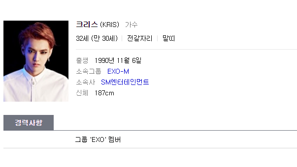 중국계 캐내다인 크리스는 2012년 그룹 엑소와 엑소M으로 데뷔했으나 2014년 SM엔터테인먼트를 상대로 전속계약 무효소송을 내고 탈퇴했다.